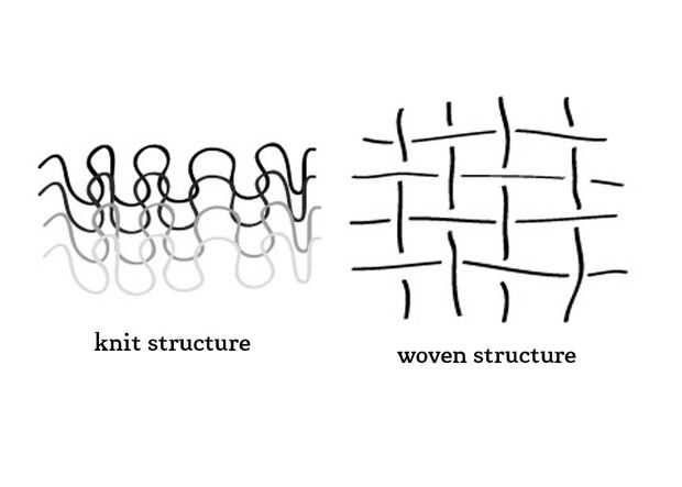 Primero, una nota rápida acerca de la diversa estructura de tejidos de punto y tejido: Knit telas se construyen en una pieza continua de hilo, cada fila es un andamio que está en la fila siguiente. Así que al final tiene una estructura de líneas paralelas de hilados. Tejidos con hilo (o hilo) en dos direcciones perpendiculares.
