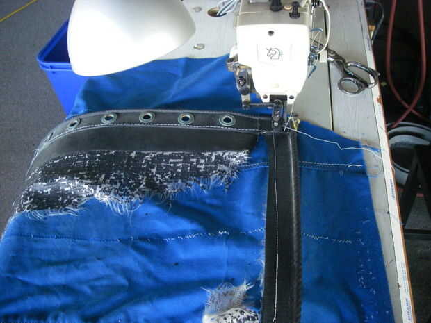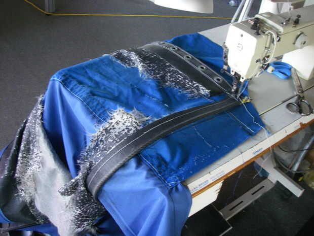 Cosí algunos trozos para hacer una pieza grande unas pocas pulgadas más grandes que la halftramp por todos lados. Usé la "costura sobrecosida plana" que es la costura fuerte sirve para coser los pantalones vaqueros.