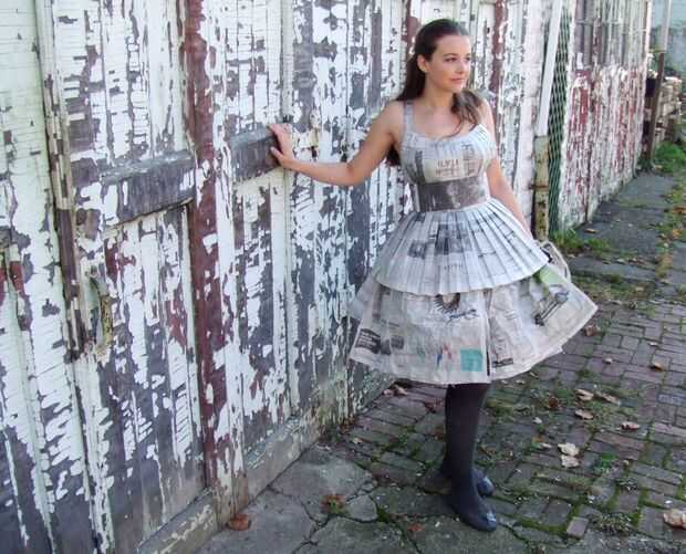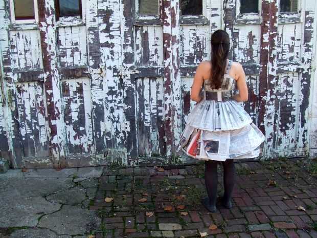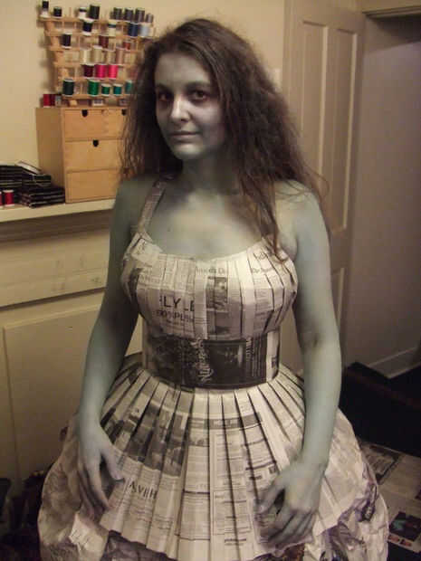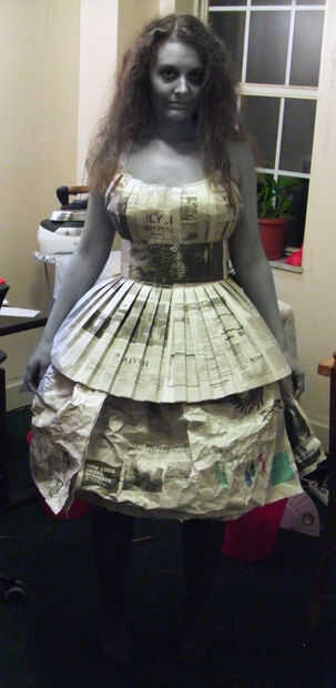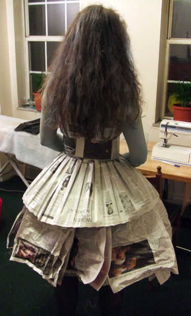 Esto fue parte de un disfraz de Halloween de la vieja dama de gris, un apodo para el New York Times. (Por lo tanto, el maquillaje y el peinado.) Consiste en una blusa cabida, plisada, una enagua de la hinchada, y una pretina extraíble, todo ello totalmente de periódico e hilo, pegamento ni cinta utilizada en el proceso. Es asombrosamente cómodo y usable.