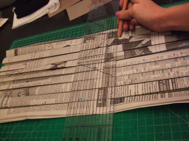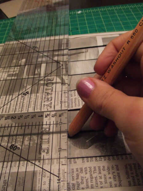 -Tomar 2 piezas plegadas miden a 1 1/2 pulgadas por encima del punto de centro y trace una línea a lápiz a través de los pliegues.