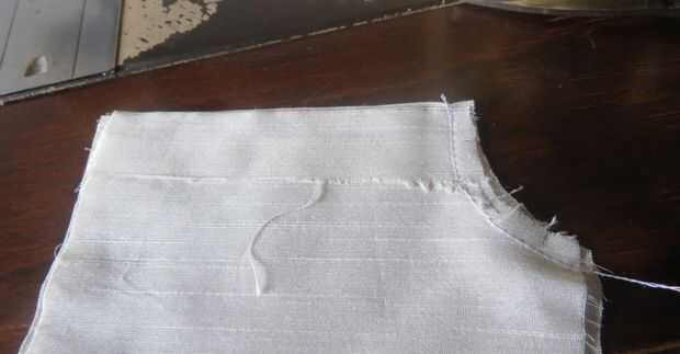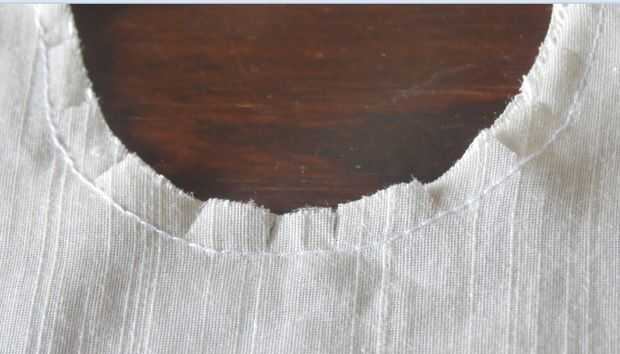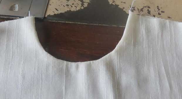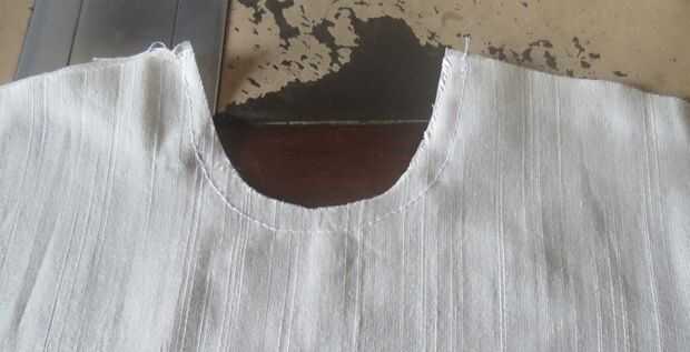 Mantener ambas partes de la blusa de la parte delantera y coser el escote y poner marcas de corte pequeñas y hacia el lado correcto. Consulte la imagen.