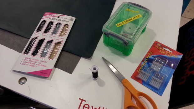 Ya que estoy haciendo esto en TechShop, estoy usando su máquina de coser básica. Sólo tiene que suministrar las agujas (que también encontré en la tienda de dólar) y usted puede sacar un juego que tiene los pies y todo que lo necesario para la máquina.