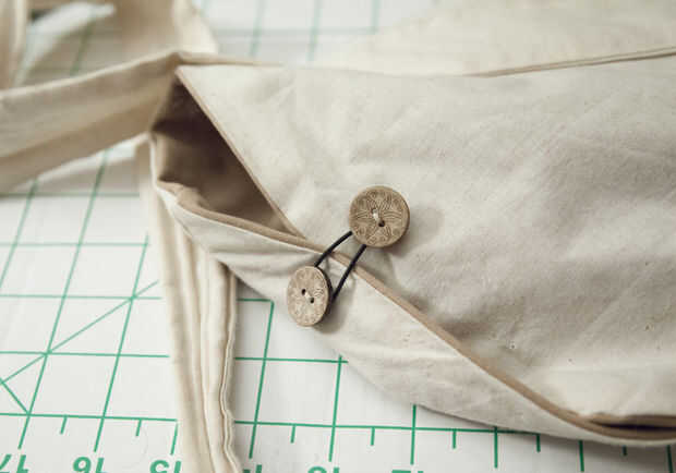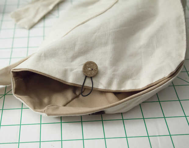 Coloque un botón en la parte superior del nudo del elástico en la parte superior "tapa" de la bolsa con el lazo hacia el borde. Este botón no es necesario, pero cubre el nudo y se ve bastante. Coser el botón a la bolsa, coser a ambos lados y entre los extremos del lazo (justo debajo del nudo). Esto debe asegurar el elástico así como el botón.