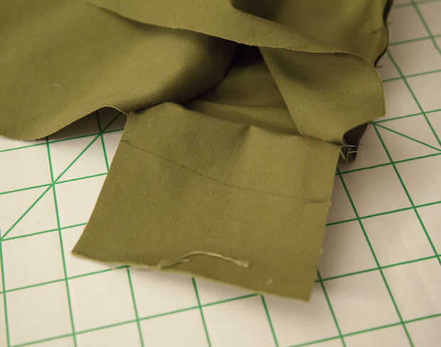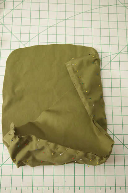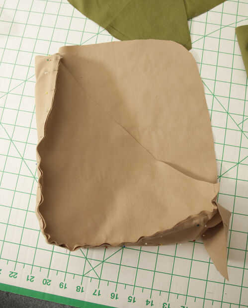 Perno de la frente, el rectángulo y la espalda de forro derecho contra derecho, como se muestra. Marcar con regla y recorte el exceso de pieza del rectángulo. Coser con un margen de costura de 1/2".