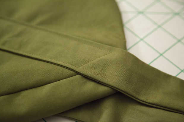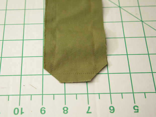 Rollito la correa a través del extremo abierto, como si invertir un calcetín del tubo. Esto es muy tedioso; Lo siento. Remeter los bordes crudos y pespuntear para terminar.