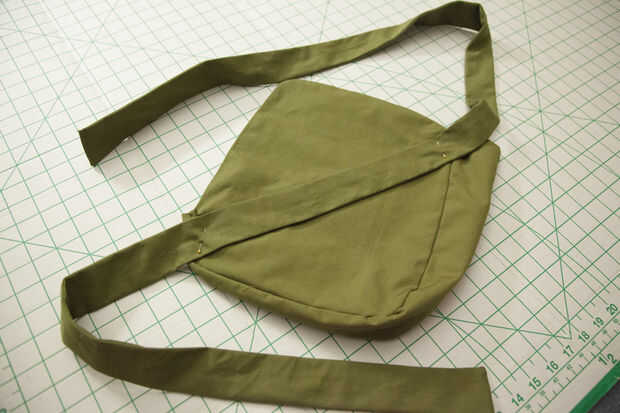 Coloque la correa en la parte posterior de la funda y el perno en su lugar. Prueba y ajustar según sea necesario. Para el bolso crema, tenía 16"-13"-30 "(debajo de la bolsa, a través de la bolsa, por encima de la bolsa), y para la bolsa verde tenía 22"-12"-35".
