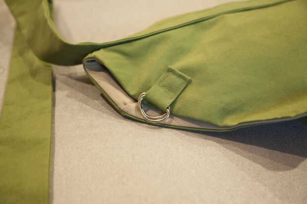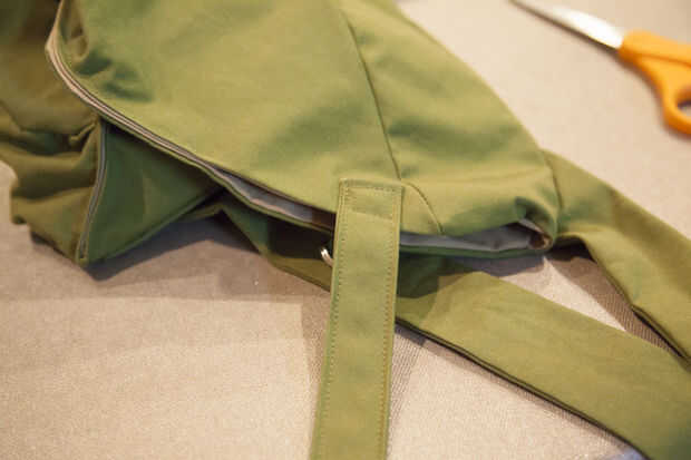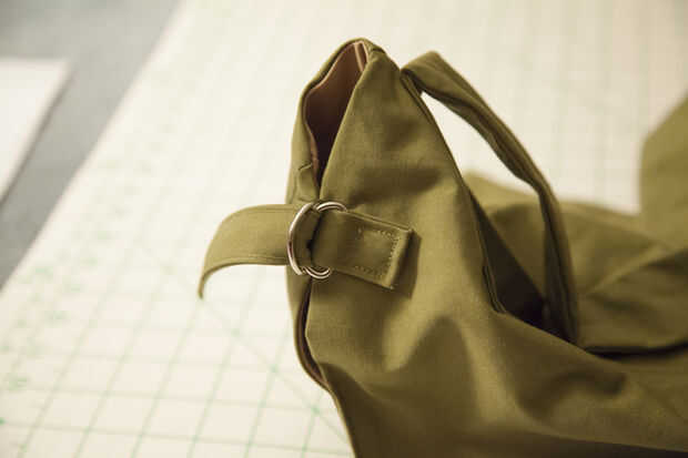 Cortar una tira de 2 x 13" con su correa. Doble 1/2" hacia el interior de cada borde y pulse y recortar las esquinas. Luego doblar por la mitad para obtener una tira de 1 x 6" y coser todos los bordes. Coser la lengüeta en el borde inferior de la abertura, frente a los anillos en D de la bolsa.