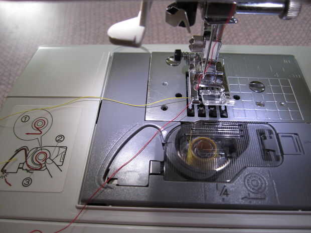 El primer paso para todo este proceso es la máquina roscadora. Que va a utilizar dos colores de hilo - amarillos en tu bobina y rojo de la bobina.