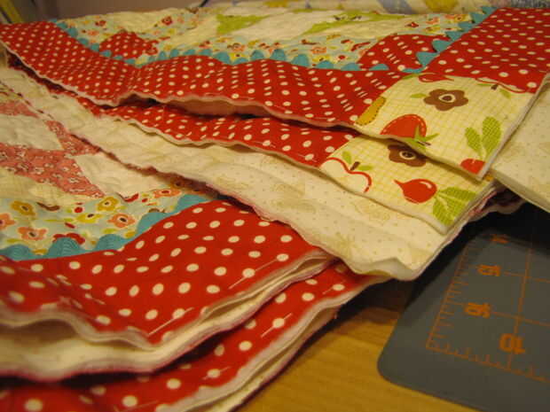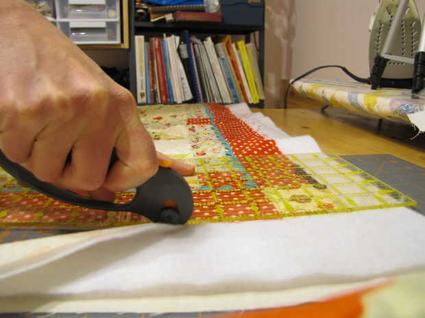 Usando tijeras o un cortador rotatorio, con cuidado recorte el exceso bateo y forro de tela. No tirarla hacia fuera! Estos pequeños trozos de bateo son ideales para manualidades, peluches y adornos de árbol de Navidad. Asimismo para la tela de forro. Si usted no tiene loco acolchado, no podría saber que piezas tan pequeñas como un cuadrado pulgadas son muy útiles. (Sé, acumulan mucho? jajaja)