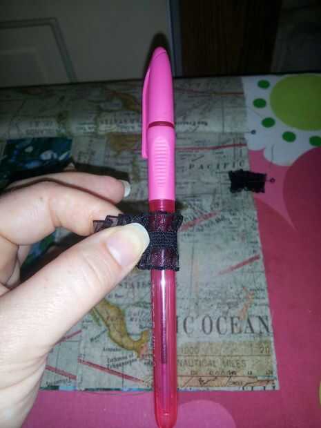 Tomar su elástico y medir alrededor de un lápiz es no mucho, poner en su lugar y dejar extra colgando a los lados... entonces el pin con el lazo en el centro en 6" afrontar y al contrario en 5 1/2" ish los dos deberán estar alineados (ver el cuadro, estas actúan como un dispositivo para mantener tu libro cerrado cuando una pluma se rosca a través de ambos lazos.)