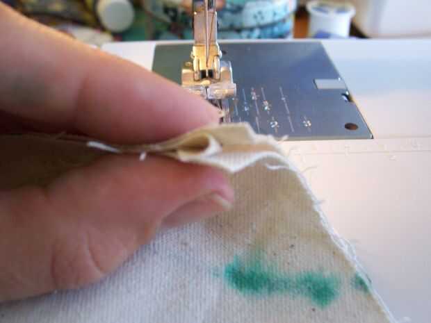 Ahora doblar las telas para hacer la esquina (esto hará sentido cuando la tela está en las manos). Una vez más, meter los márgenes del camino y coser. Esta vez, en el extremo donde se cruzan todas las tres piezas de tela, puede coser el extremo. Pero asegúrese de pespunte.