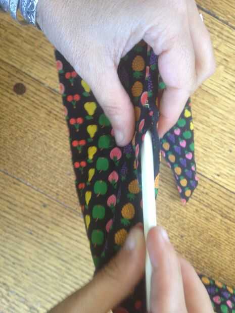 Ahora que han terminado su tiempo a la derecha del abrigo de costura. Alcanzando en a través de sus 2" apertura uso su dedo para empujar la punta llevará el agujero y tire la punta hacia el lado derecho, repita para el otro lado. Ahora para obtener agudos puntos utilizan un lápiz para empujar el punto desde el interior. Luego llevar todo a la tabla de planchado y presione este cachorro plana!