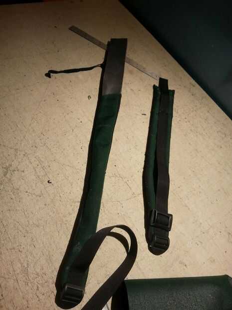 Cosas con espuma (ayuda usar talco para obtener con menos fricción) hasta que la espuma es aproximadamente 1-1/4" desde el extremo abierto, deslice el Ajustador del esternón en remate en el remate punto y en la parte superior de la correa, borde coser el extremo de la correa de dar una vuelta juntos y cortan y doran correas exceso.