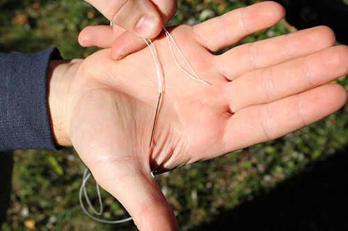 Quieres un bonito hilo de rosca grueso para este trabajo de costura. Usted puede usar hilo de tapicería si lo tiene; Si no, seda dentículo funciona igual de bien. Una vaina de bici montaña requiere 5-6 pies de hilo. Tomar un gran palmo de brazo de hilo y vamos a empezar.