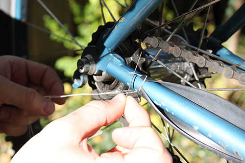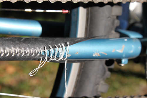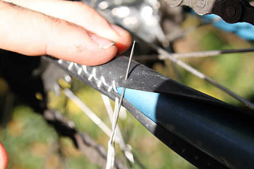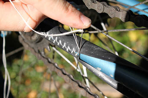 Las primeras pocas puntadas son los más difíciles. Utilice las marcas realizadas anteriormente para espaciar uniformemente sus puntadas. Pinzar el tubo con los dedos de la mano de no coser como vas y recuerda siempre empuje la aguja hacia arriba a través de la parte inferior del tubo. La parte puntiaguda de la aguja siempre debe estar viajando lejos de la figura de la bicicleta!