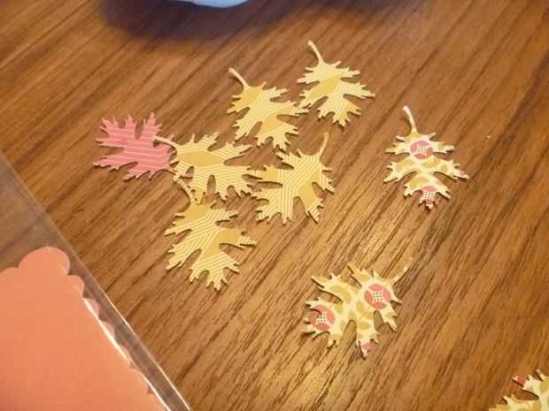 Recomiendo usar ½' 1" largo formas. Utilizar entre 3 y 5 hojas por tarjeta. Si usted quiere cortar su mano libre de hojas, sólo dobla el papel a la mitad y corte. Óvalos puntiagudos son fáciles de cortar, o puede cortar formas de hojas de arce, hojas de roble... una hoja de álamo es básicamente un corazón al revés. Use su imaginación (o internet).