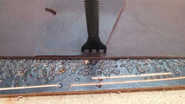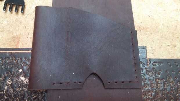 A continuación, marcar y perforar los agujeros de costuras en el titular de la tarjeta de negocios. Esto tendrá que ser cosido antes la tapa frontal se pega a la cubierta principal.