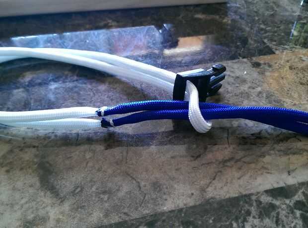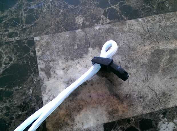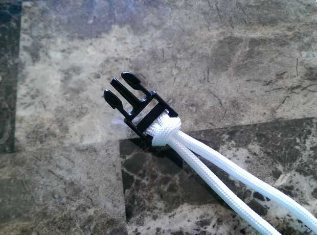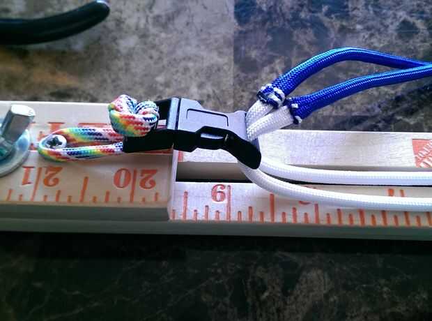 Doble la mitad así que usted puede deslizar el centro de la misma en una sola pieza de la hebilla. Deje un pequeño bucle en la parte superior de la hebilla. Deslice los extremos sueltos del cordón a través de este lazo y tirar cómodo. Esto dejará un bucle en el interior de la pulsera, el lado que sea contra su muñeca.
