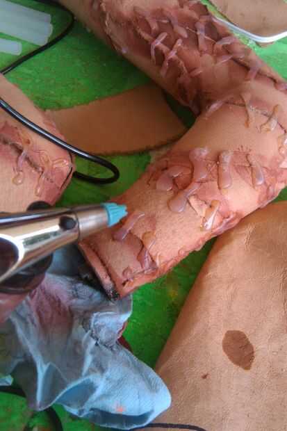 a continuación, agregue las líneas largas de pegamento caliente superpuestas las piezas de cuero. Estos serán tus puntos una vez que enfríe. Colocarlos en el espacio diferente de cada pieza. Después de que se seque. mezcla hasta un rojo intenso a marrón pintura para ir a lo largo de cada uno de los bordes de las costuras de las piezas de cuero, esto dará un aspecto rojizo. Luego repasar con un gris medio para darle cierta profundidad y que quede más realista. Usted puede incluso utilizar una esponja de textura pequeña si no tienes un aerógrafo.