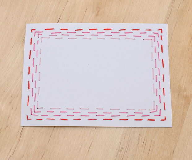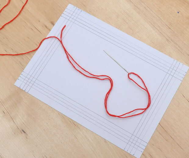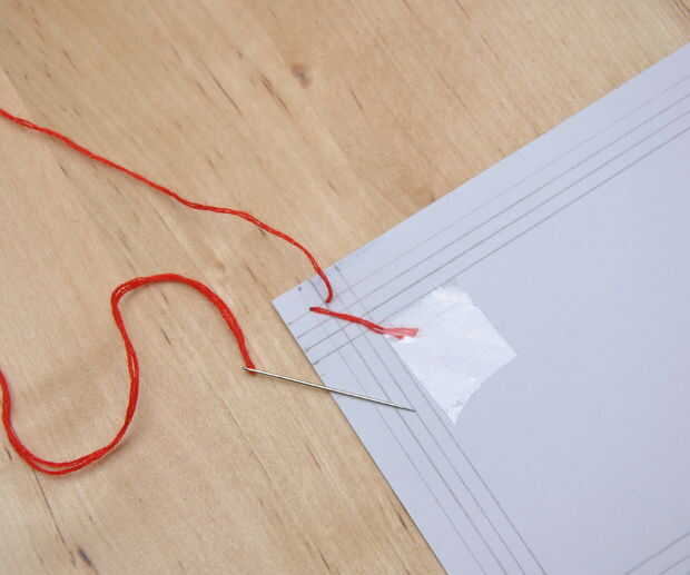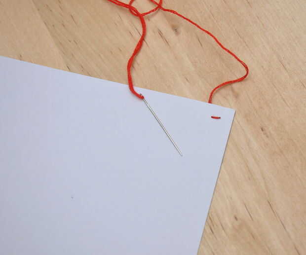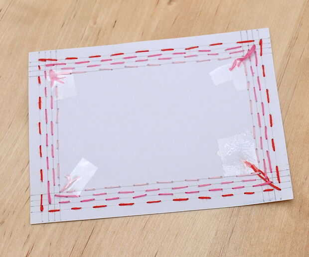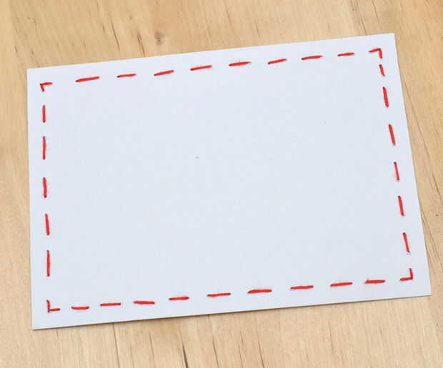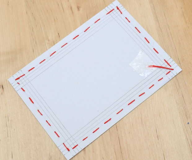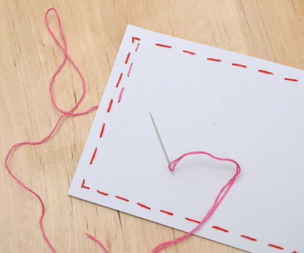 Cortar un trozo y luego dividirlo por la mitad así que tienes 3 hilos. Enhebre la aguja. A partir de la esquina y empezar a coser su tarjeta. Mantiene pulsado los extremos de la cadena con solo cinta.