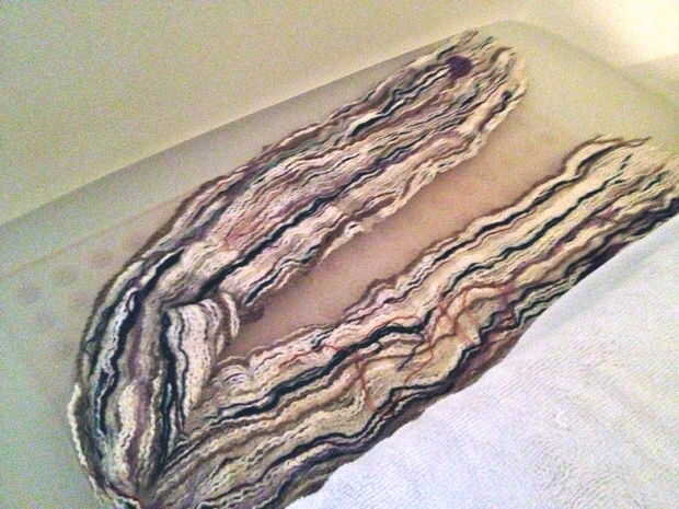 Coloque el pañuelo en el agua, una sección a la vez, un poco de agitación con las manos. Continuar hacerlo hasta que se disuelva el Solvy; Esto le llevará sólo unos minutos.