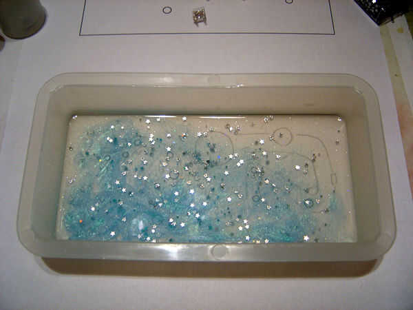 Mezclar aproximadamente 1/2 onza de resina transparente (según las instrucciones de su fabricante). Puede Agregar algún brillo u otros desechos cósmicos de su elección a esto si quieres. Lo catalizan y viértalo en el molde. Volcar el molde alrededor para asegurarse de que la resina cubre todo el fondo del molde, y es bueno dejarlo levantarse hacia los lados un poco.