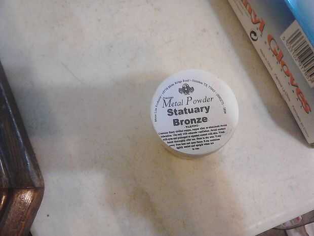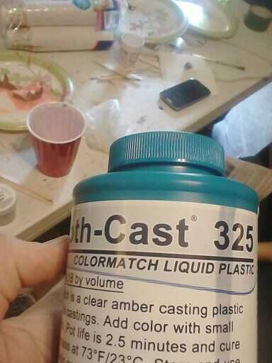 Kits de resina tienden a tener una parte A y parte B, mezclar juntos y se obtiene la resina. Maravilloso concepto. Les dan una proporción 1:1 o lo que sea la proporción de su producto necesita. Mezcle todo junto en un vaso desechable de tamaño suficiente. Añadir cualquier colorante que desee utilizar, este kit vino con "Bronce estatuario" y es lo que terminamos usando. Resultó maravillosamente.