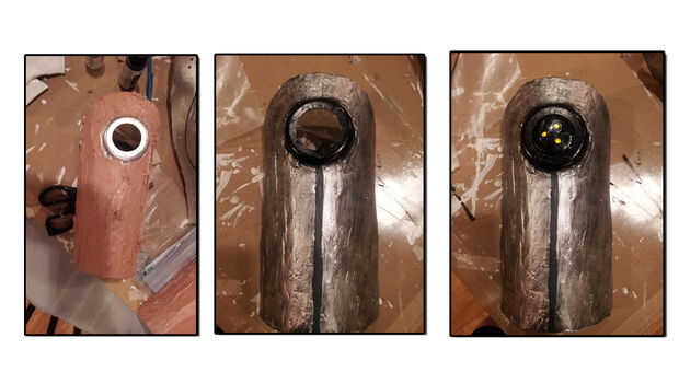 Una vez que haya curado el Bondo, puede empezar a lijar. Recomiendo usar una lijadora eléctrica con una media o papel de lija gruesa a tierra las partes ásperas y luego una fina para pulir los detalles (incluso puede utilizar una mano de lija esponja si prefieres). Cuando todo es tan liso como desee, comenzar capas de Gesso, permitiendo que cada capa se seque antes de cada aplicación posterior. Procederá a lijar el yeso con una lija fina si es necesario y luego aplicar la pintura. Entonces pop el resto de su palo de luces LED en el caso externo. Instale anillos en d (he utilizado bondo) y elástico en los guanteletes para sostenerlos en sus brazos