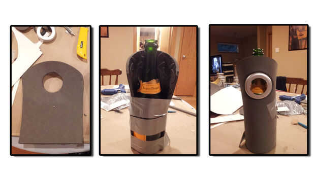 Usar una pistola de calor, calentar sus guantes hasta que estén flexibles y envuélvalos alrededor de algo del tamaño de los brazos mientras se enfría y formas (utilicé una botella de vino). Una vez han enfriado, colocar el gabinete externo de las luces LED en el agujero. Porque ahora se curvan los guanteletes, la voluntad caso externa no cabe en el orificio fácilmente simplemente conseguirlo color como sea posible y cierre con pegamento caliente. Deje que se enfríe. Intente poner el resto de la pieza de LED en el gabinete externo para asegurarse de que todo encaja y retire (si la pieza de LED no caben en la caja externa, utilice su pistola de calor para volver a calentar el pegamento ya aplicado y tratar de colocar de nuevo el caso externo.