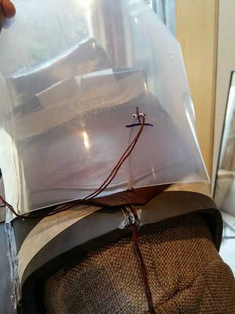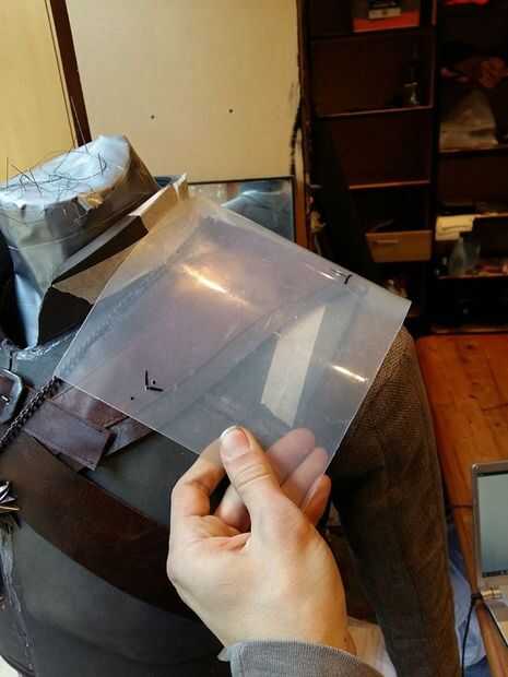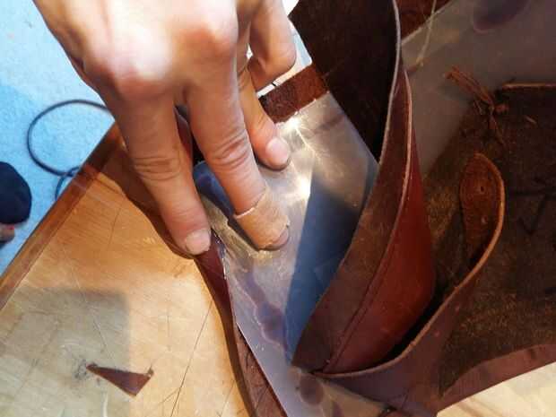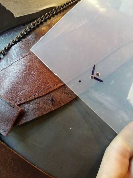 Vas para perforar el plexiglás en estos puntos y a través de estos agujeros vas a conectar el plástico y cuero por simplemente a mano la costura.