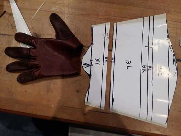 Como no tengo un patrón establecido para estos guantes que tuve que improvisar, usando cinta adhesiva, envuelve la mano, corte abierto y capa sobre papel para hacer mi patrón.