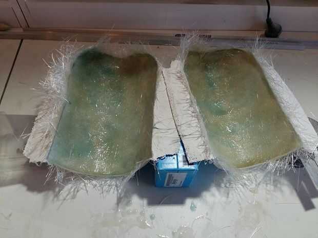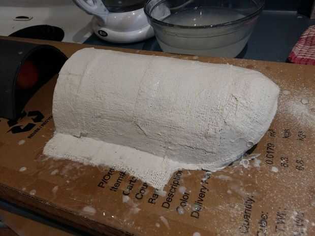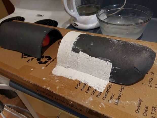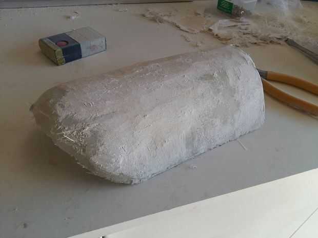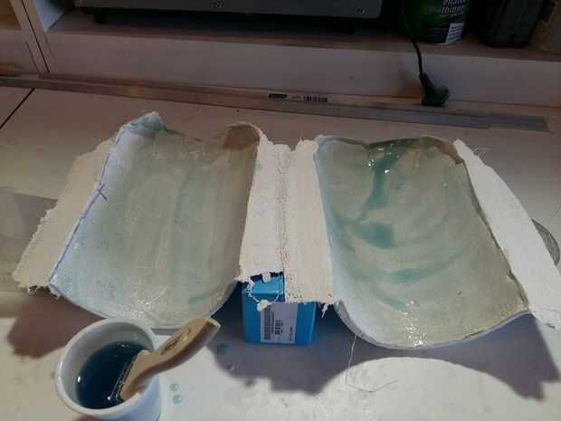 Hacer estos hombro comencé con los recortes de espuma de eva básico 2, después de la remodelación con la pistola de calor pegué ligeramente hasta una base de cartón. Usar vendas de yeso hice un molde real rápido y barato de los pedazos del hombro, que más tarde fueron lleno de resina de poliéster y estera de fibra de vidrio.
