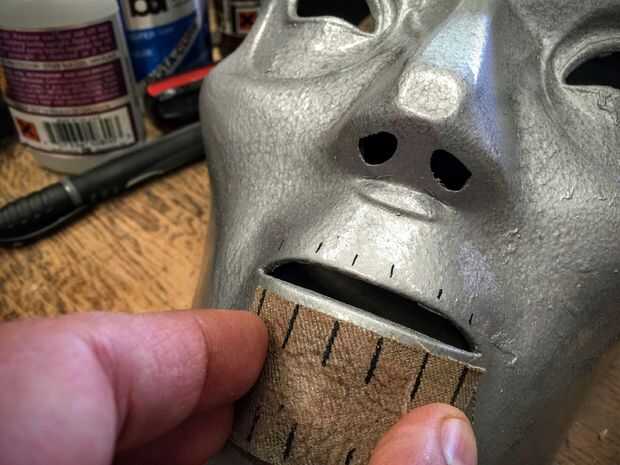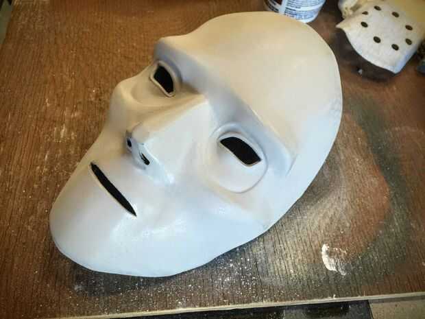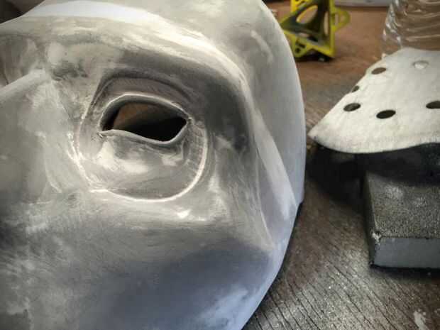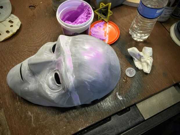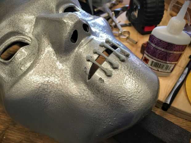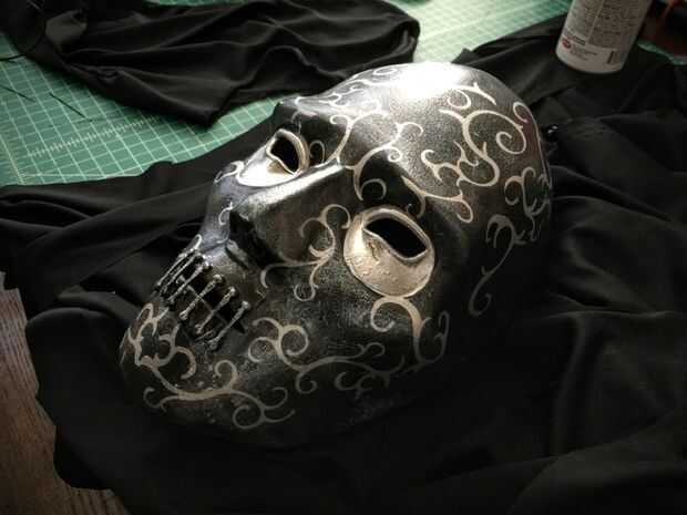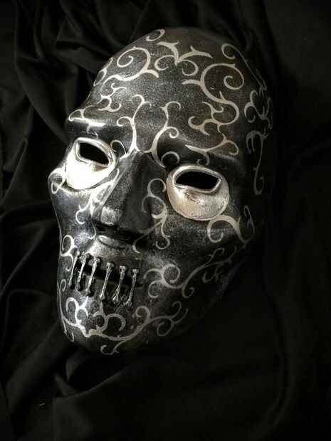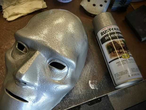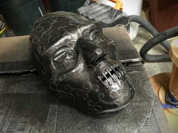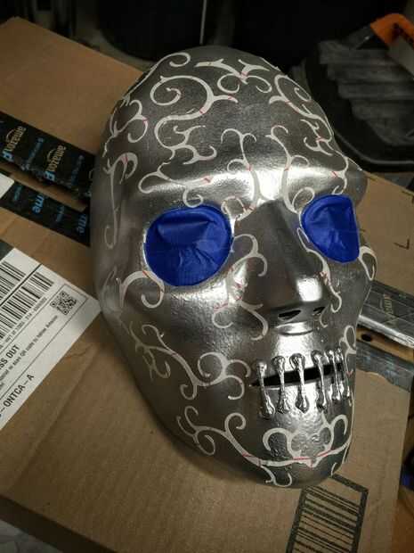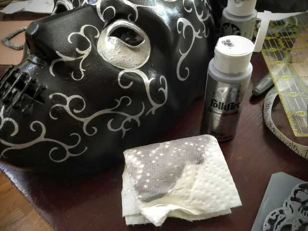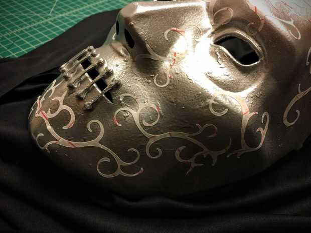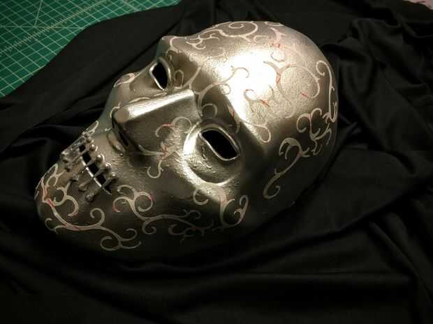 Hizo 2 capas de imprimación de relleno, luego utiliza una pintura de plata con textura martillado para la base. Luego dibujó un número de diseños rizados finos en el equipo, les refleja para cada lado de la máscara y cortar con un cortador del vinilo. No tengo un plan para saber cómo aplicarlos, acabo de probar para asegurarse de que estaban reflejados como posible en la máscara y distribuido uniformemente alrededor. Yo uso el papel de transferencia de vinilo como esta formado y adherido a la superficie, pero también fue fácil pelar después de rociar la máscara con un color metálico oscuro.