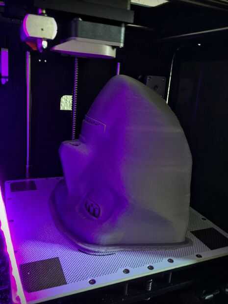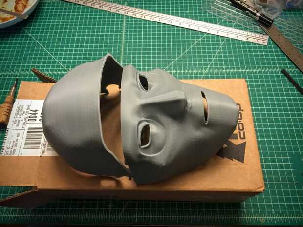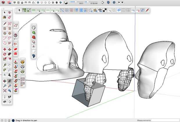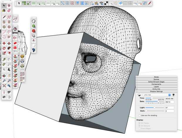 Si estás familiarizado con SketchUp, modelado orgánico otro plugin es artesanal, ya sea trabajar, aunque ambos son un paradigma diferente para modelar que es el típico flujo de trabajo de SketchUp. Encontré un modelo en la Galería 3D de una cabeza humana y modelado de la máscara para adaptarse a él, no llegó sobre la escala hasta que se terminó el modelo, es fácil en SketchUp para volver a escalar un objeto con la herramienta escala o cinta métrica. Cuando terminó me tomaron medidas de mi cabeza y traté de la máscara de ajuste de la escala. Tuve que dividir el modelo para caber dentro de la impresora, y después de probar algunas opciones encontró una buena división angular por encima de las cejas funcionó bien.