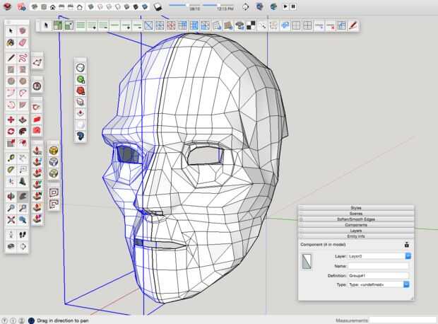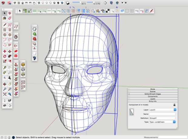 Creando el modelo para esta máscara comenzó como un experimento de sábado por la mañana, con algunas herramientas y métodos estaba seguro podría funcionar. Yo trabajaba en SketchUp utilizando algunos plugins, SubD, vértice herramientas y Quad enfrentará a herramientas que permiten modelos más orgánicos que normalmente se ve de SketchUp. Después de cierto éxito inicial con el modelo me emocioné y pasó el resto de la mañana puesta a punto y completar la malla y que realmente fue la motivación para hacer el traje entero.