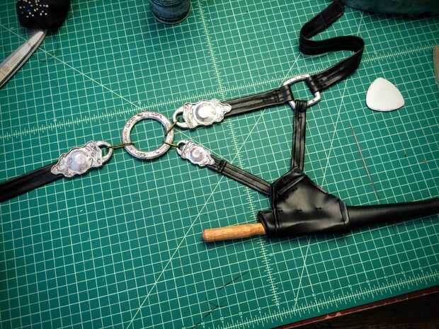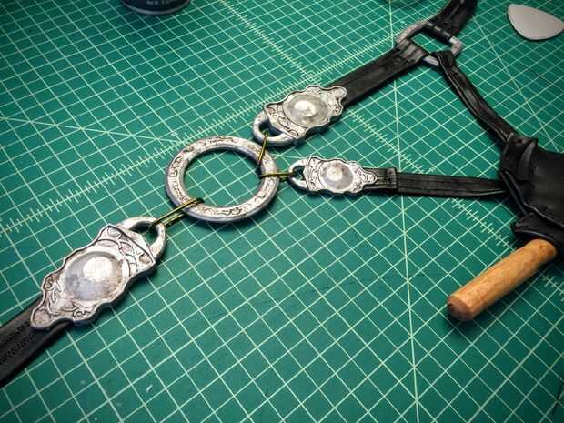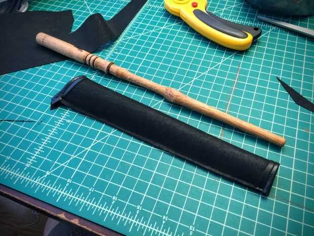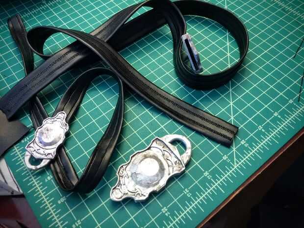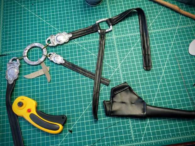 La banda fue el mismo he estado usando en otras partes de este traje, doblado sobre y cosidas en una máquina de hacer sólo un poco más gruesa de piel sintética. Fue insertado en las hebillas con pegamento de cianocrilato y llevó a cabo muy bien. Cosí dos anchos de banda, uno para la correa principal que fue de 1-1/4" de ancho y un 2 º para la funda de la varita que era aproximadamente 3/4" de ancho e impreso un broche que era levemente más pequeño para el cinturón más pequeño.
