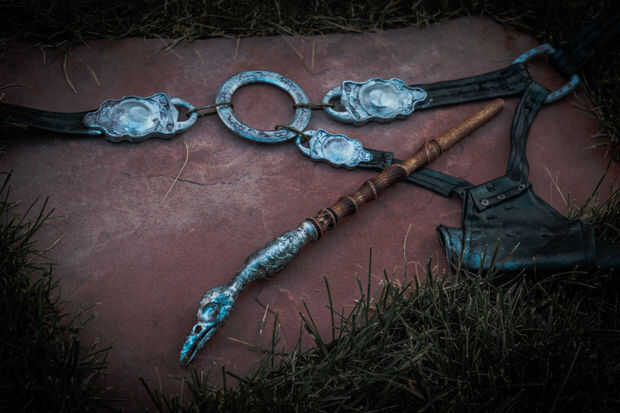 Creo que parte de la diversión en hacer un traje como un mortífago que totalmente se puede personalizar. Había muchos personajes de diferentes muerte eater con variaciones en sus trajes que abre a las posibilidades. Este cinturón fue diseñado para ser similar a una versión usada por algunos de los personajes de la película, pero no es una copia directa. Modelo de los broches con algunos simples detalles swirly para imitar los detalles de la máscara, con un lazo para colocar en el centro del círculo y con una cámara de vacíela para insertar la correa y fijar con pegamento.