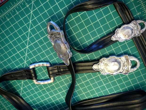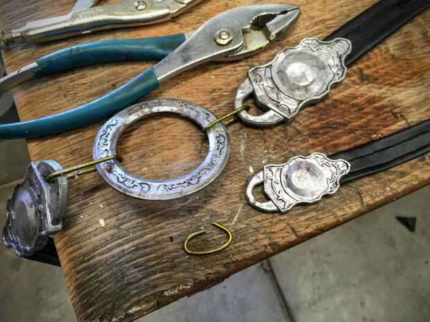 Cortar un gancho de alambre y doblado y venció en los lazos para sujetar los broches en el centro del círculo y luego calibrado por ojo donde la funda de la varilla debe ser y cosido en su lugar. (En verdad me gustó mi primera colocación, por lo que se puede ver en las fotos finales el cinturón más pequeño se corte y vuelva a conectar. Funcionó bien, al ser dueño de mis errores).