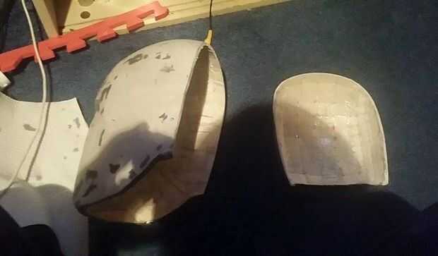 Porque la campana era sólo ligeramente más grande que mi cabeza, que no se deslice, así que tuve que hacer un corte cerca de la parte posterior de la campana. Trazada en una línea más allá de la marca a la mitad por lo que no muestran de frente y cortar con una dremmel.
