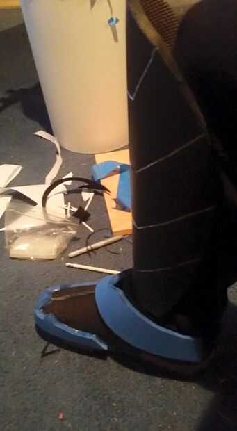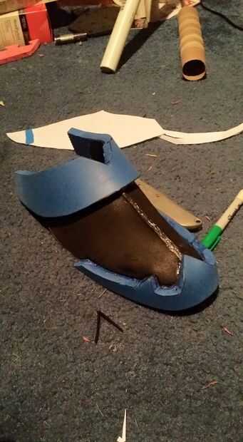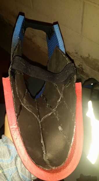 En cuanto a las tapas de arranque tipo de alas por supuesto usé mi zapato y cortar varios pedazos de papel para hacer una plantilla. En los primeros pocos cuadros, fue cortar la espuma negra de la hoja de la espuma de kraft y las piezas más gruesas azules fueron corte de espuma de EVA. Todo fue unido con pegamento caliente, y he añadido las cintas elásticas en la parte inferior para que sea fácilmente deslizar en y fuera de mi zapato, mientras que también mantiene en su lugar mientras llevaban.
