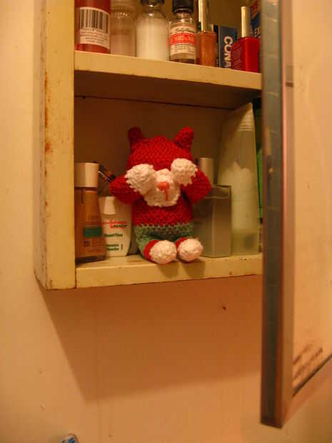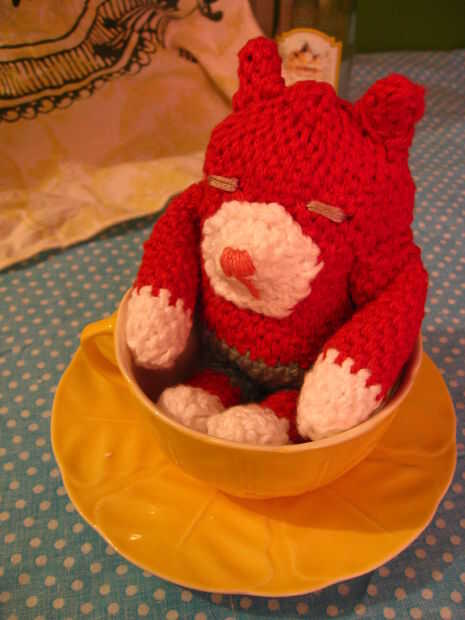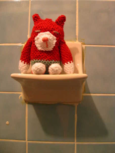 este pequeño individuo está hecho con hilo de estambre de peso León algodón y mide aproximadamente 7 pulgadas de alto. tiene armadura alambre interior tha así el puede permanecer en cualquiera posición que ponerle y se rellena con otro hilo.