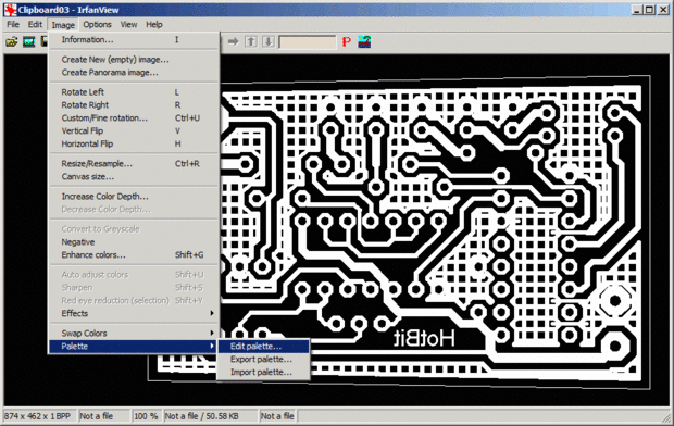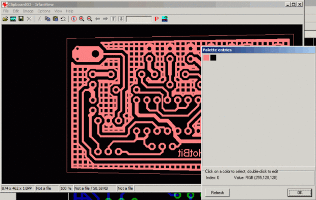 Ahora vamos a imagen -> paleta -> Editar paleta... menú de Irfanview, haga clic dos veces en la caja blanca para cambiar el color blanco para el color que aparecerá como pistas, pads y vias. Prefiero utilizar el color salmón, (RGB: 255,128,128) por dos razones: