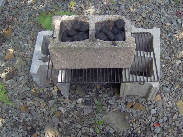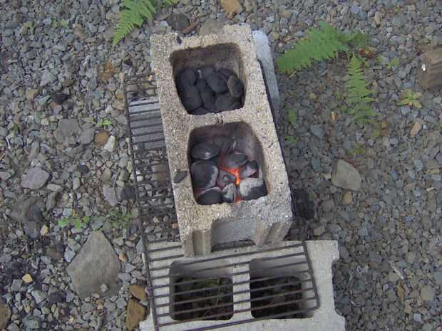 Inicialmente, cargar mi ahumador con 32 brickettes. Para comenzar a las brasas, I generalmente poner 4 "cerillo" tipo brickettes en la parte inferior de cada agujero en la cynderblock con un fusible de papel, el equilibrio de los agujeros se llenan de carbón regular y luz para arriba. Esta semana no tenía ningún "cerillo", así que poner 4 carbones regulares en la parte inferior y añadido líquido encendedor un poco a ellos y continuó como normal. Me gusta la seguridad de que el carbón se enciende, pero no el sabor del líquido, así que esto me permite agregar un mínimo de líquido.