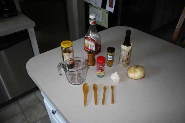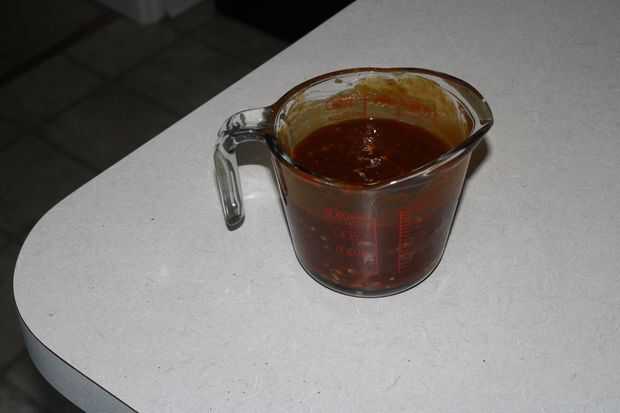 Mezclar todos los ingredientes en un recipiente no metálico. Yo generalmente sólo mezclarlo en la taza de medición después pongo en la salsa de tomate y miel. Debería ser suficiente para bañar las costillas dos veces con cierta izquierda sobre de salsa.