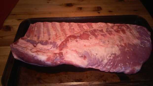 Un rack de costillas de cerdo- he comprado recientemente un untrimmed rack completo de costillas de cerdo a la venta y los atrapados en el congelador hasta que tuve un tiempo libre. Pesa aproximadamente 4 libras.