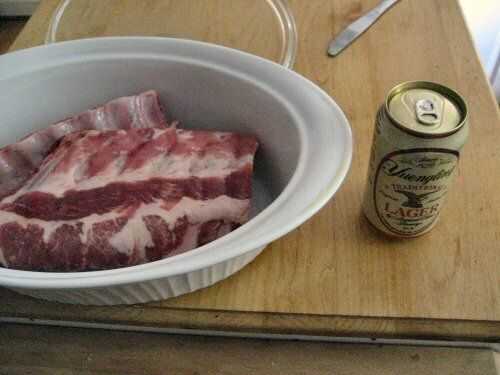 Poner las costillas en una cazuela grande. Vierta una lata de cerveza sobre ellos. Lanzar en algunos pedazos de ajo y la cebolla si quieres.
