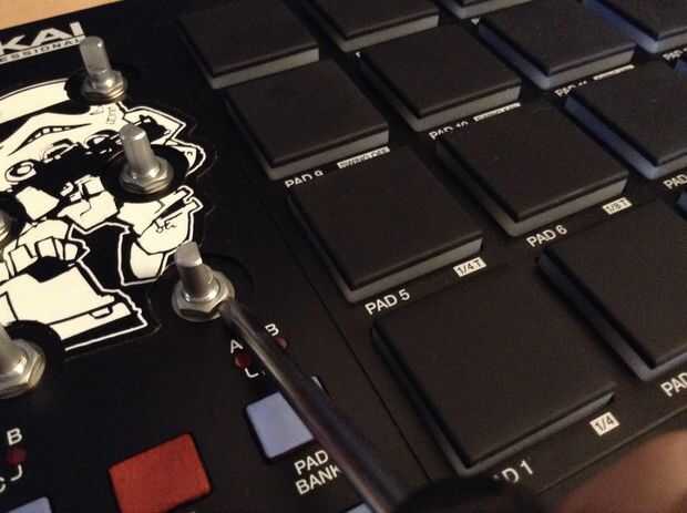 Necesitará un destornillador para la siguiente parte. Después de quitar los botones encontrará cosas reviradas metal 6 (potenciómetros). En la parte inferior del eje se encuentra tuercas que necesitamos eliminar. Simplemente utilice un destornillador para empujar un borde y debe comenzar a girar. Quitar el resto. (Hay metal arandelas debajo de las tuercas de los quite tan así)