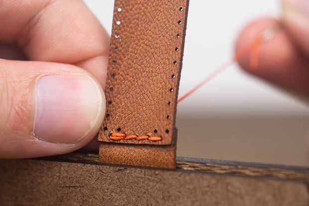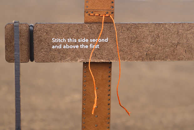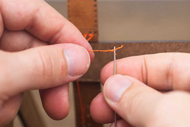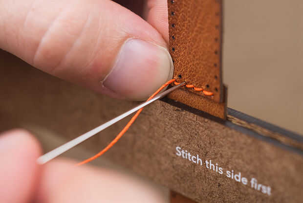 Tomar la aguja en el lado liso de la piel y pasar por el segundo al último agujero, encima el hilo existente. Esto coloca a ambos hilos en la parte posterior de la pieza por lo que pueden ser atados juntos.