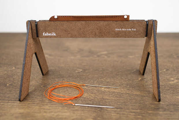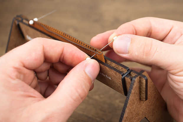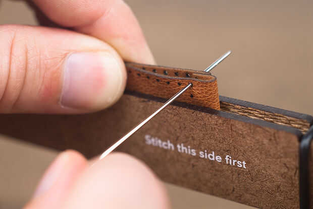 Colocar las piezas de cuero en el Pony de costura horizontalmente, con la costura pins aproximadamente 1/4" por encima de la barra. Siga el paso 5 para enhebrar las agujas con el hilo largo en el paso 4.