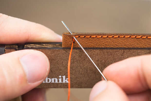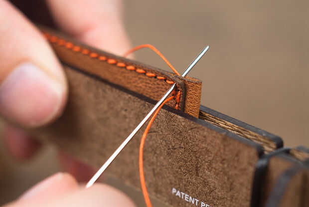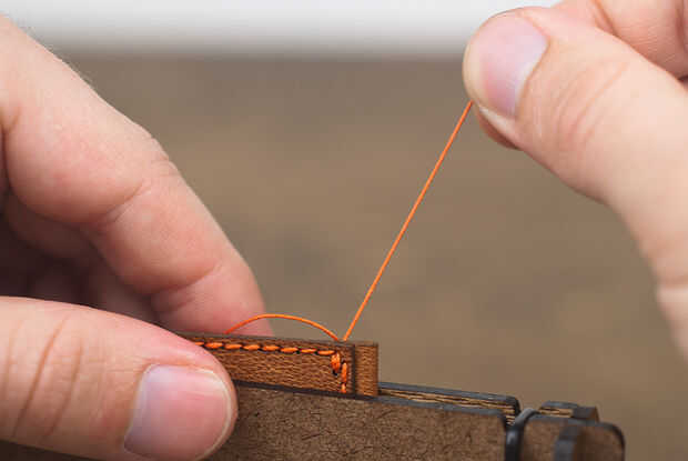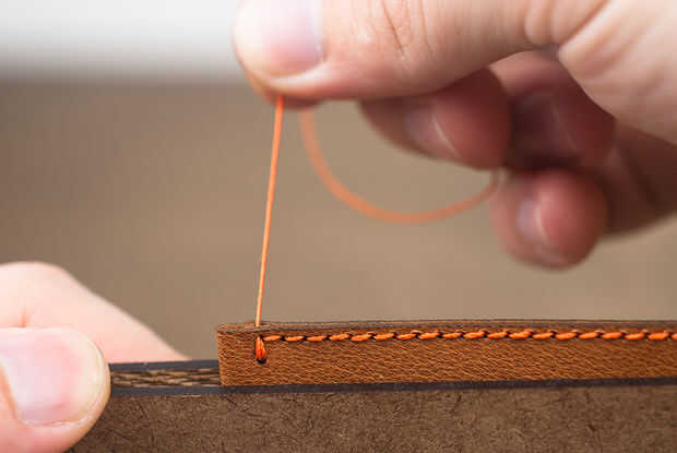 Crear un punto de cadeneta en la parada como hiciste en el paso 10, pero en vez de poner la aguja a través, ángulo de la aguja por lo que sale entre las piezas de cuero. Hay tres piezas de cuero en esta parte de la costura, así que un hilo pasará a través de una sola pieza, y el otro hilo pasará a través de dos. No debe haber ningún cuero entre los dos hilos al final de este paso.
